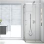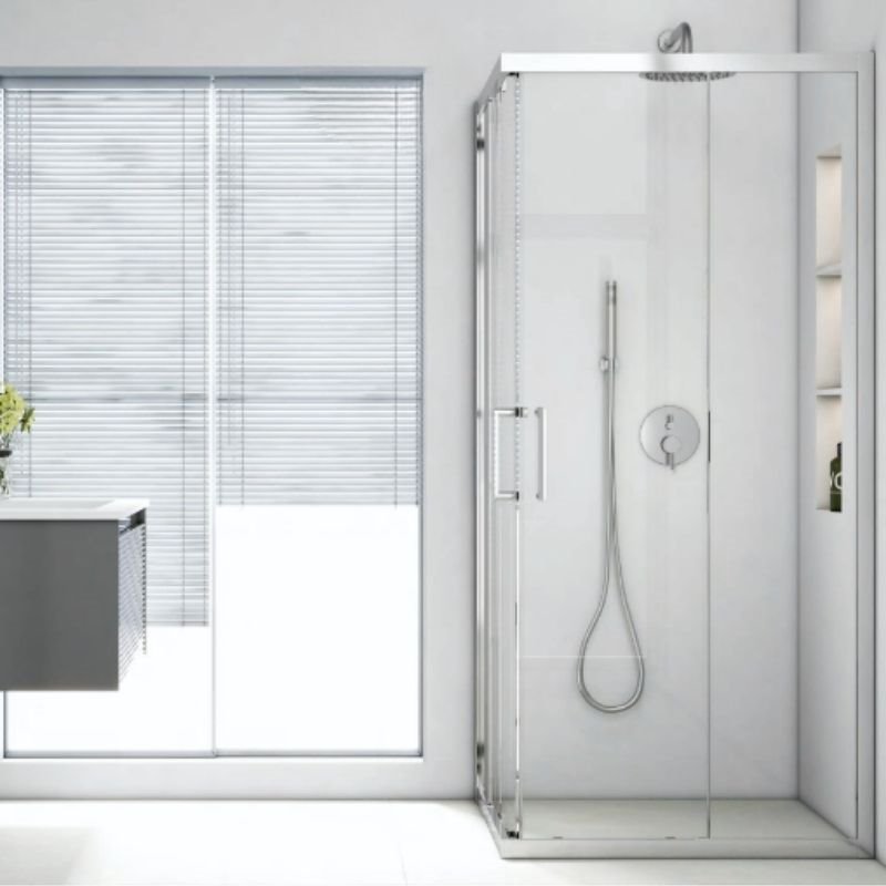 Puerta de vidrio templado para ducha en formato esquinero, diseñada para brindar elegancia, funcionalidad y seguridad al baño.