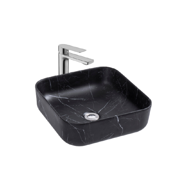 Elegante lavabo decorativo adaptable a baño modernos. Modelo sobre encimera, de forma cuadrada fabricado en porcelana.